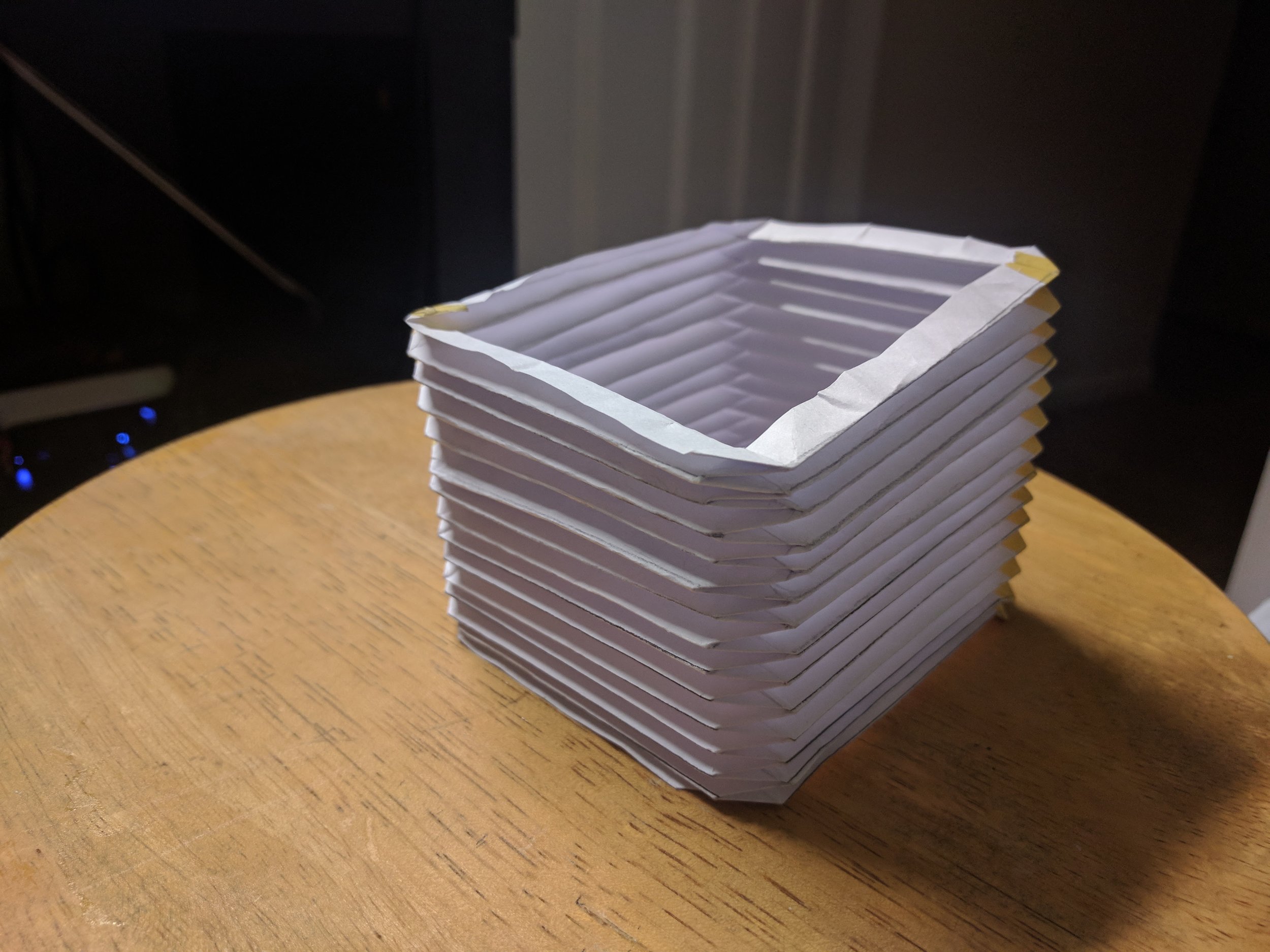 The first few steps I took were with the intent to adapt it as a tilting lens but I can still take the lessons I’ve learned and apply them to a focusing adapter. I began by making an accordion bellows using printer paper just to see if I was capable of folding one but it couldn’t take photos because of how thin the material was and how much light leaked in.