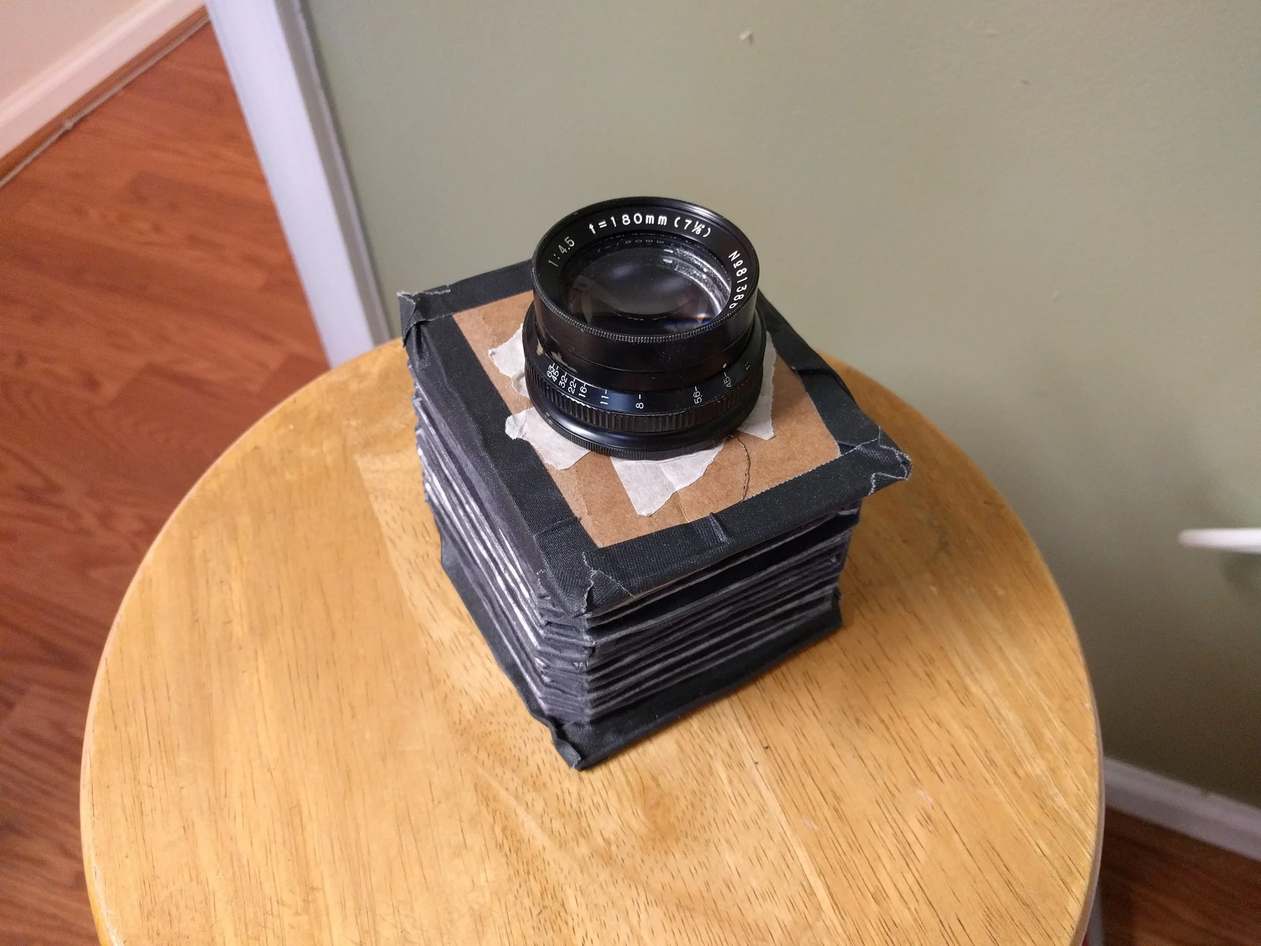 After this I made a second bellows out of poster board that actually blocked light so I was able to take a few test shots. I also tried making a more robust lens out of paper backed by gaffers tape but it didn't compress well enough to carry so I scrapped the idea.